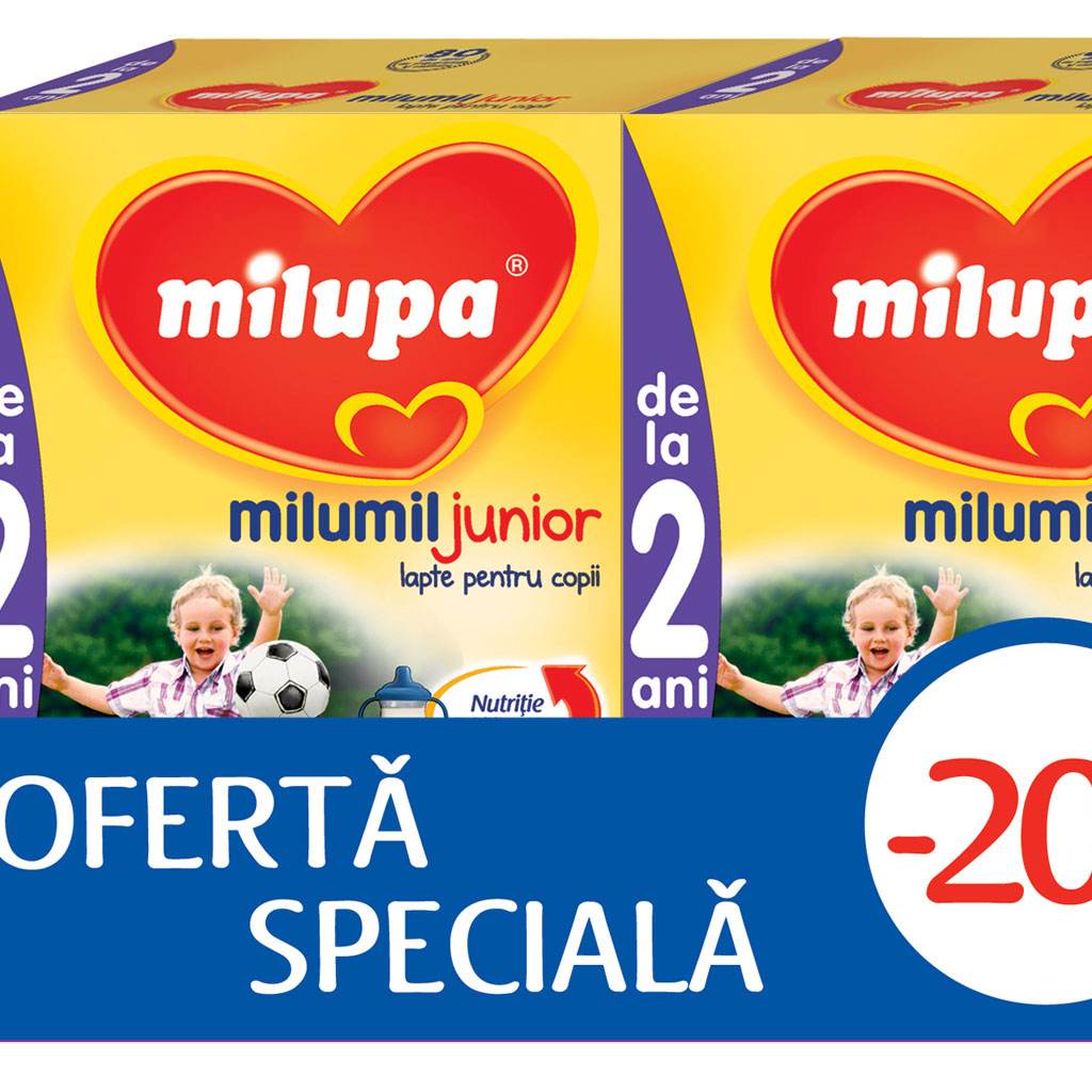 Pentru ca puiul tau sa aiba si mai multa energie pentru micile lui descoperiri zilnice, in luna septembrie ai parte de o noua promotie din inima: 20% reducere la achizitionarea a doua pachete de Milumil Junior 1+ sau Milumil Junior 2+. Promotia este valabila in limita stocului disponibil, in magazinele si farmaciile partenere (vezi lista completa pe www.milupa.ro).
